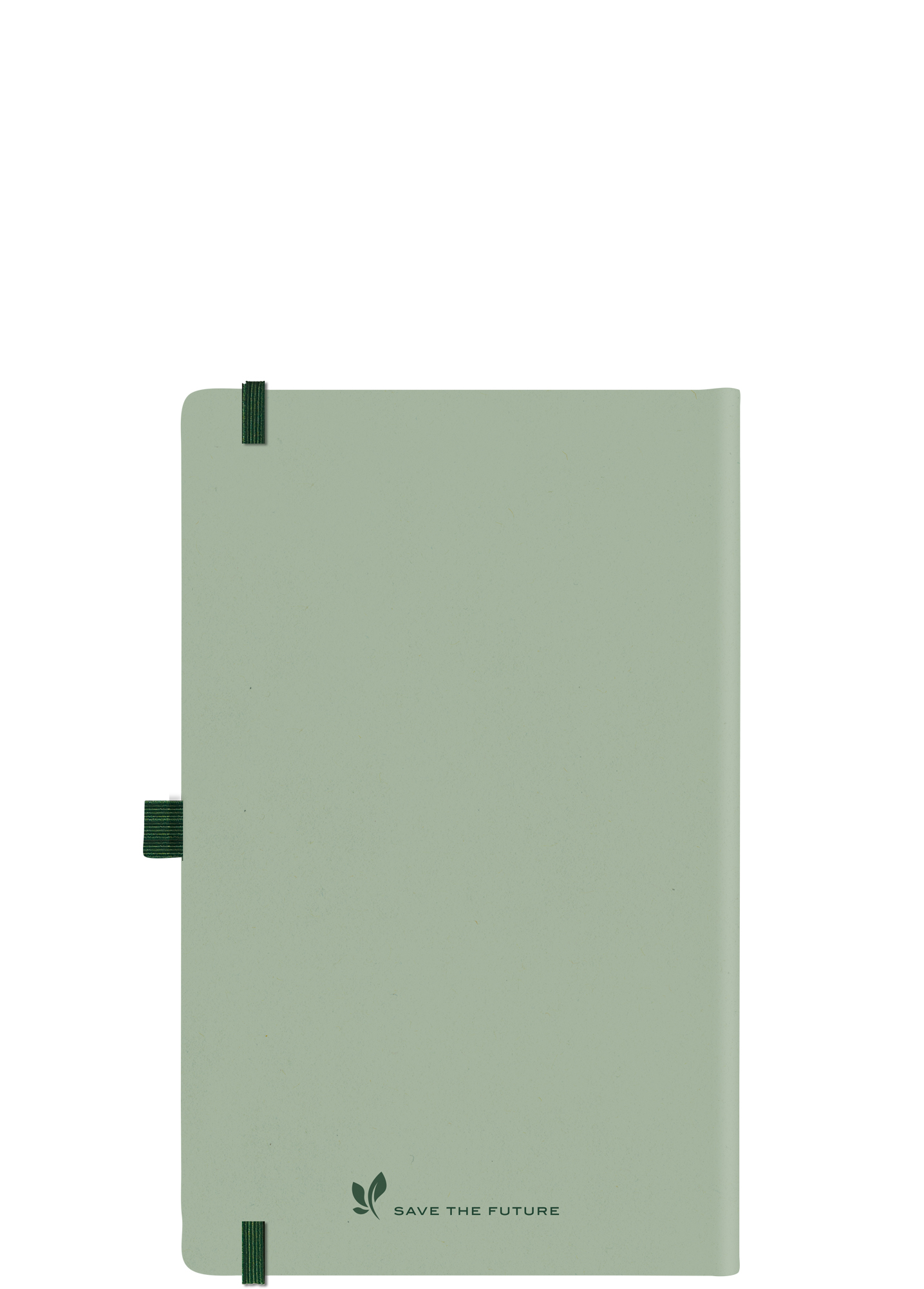 Made of 100% recycled materials,Perimeter colour on pages,Rubber,Flat cover,Rounded corners,Envelope on back cover,Penloop